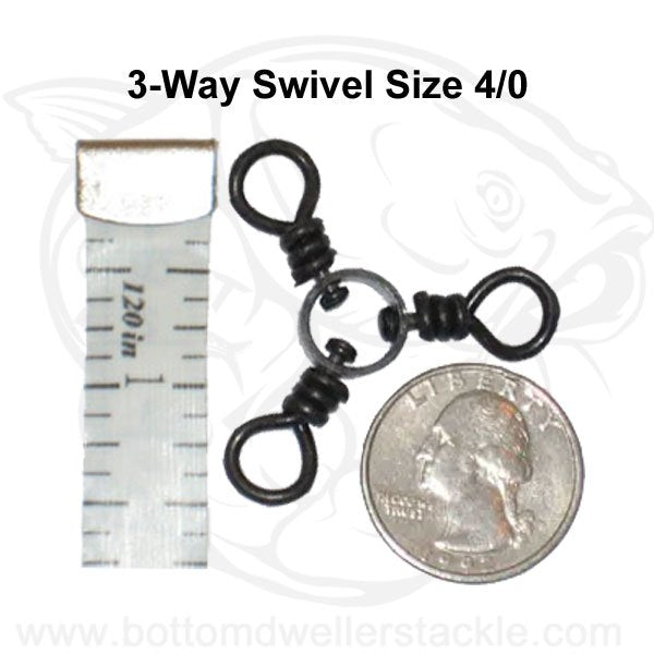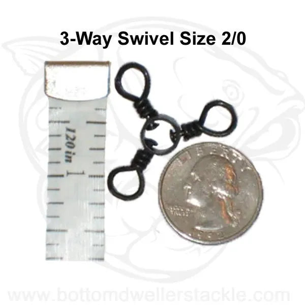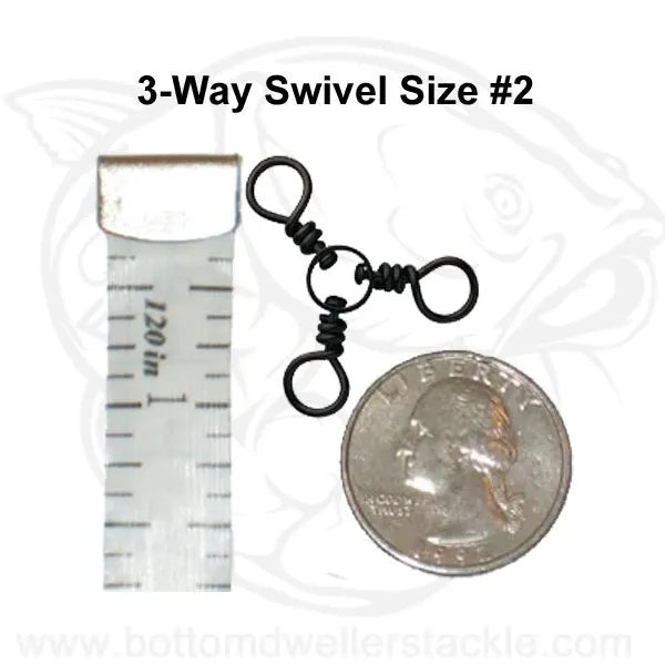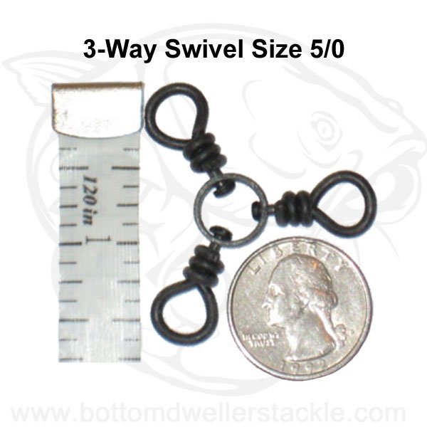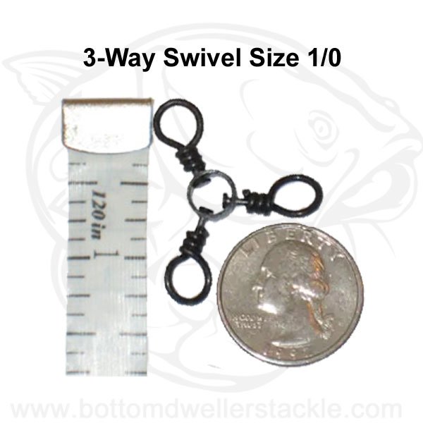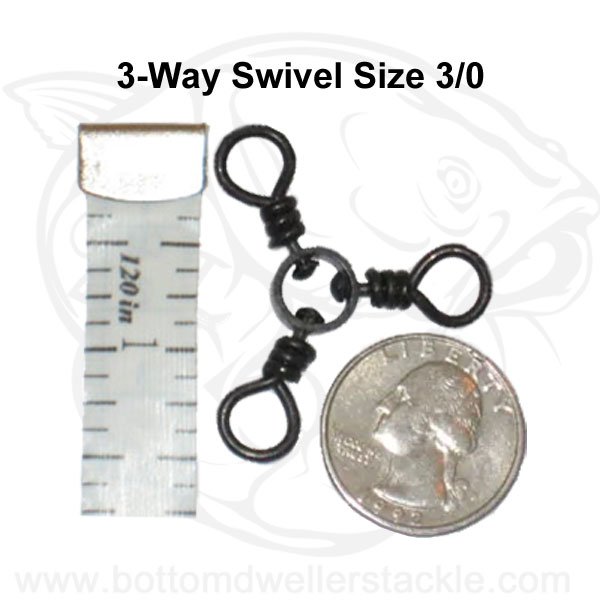 Provides evenly spaced tie points for your mainline, leader, and dropper line, while preventing line twist. 3 Way Brass Swivels with Black Finish Available in 5 sizes. 12 - swivels per pack.