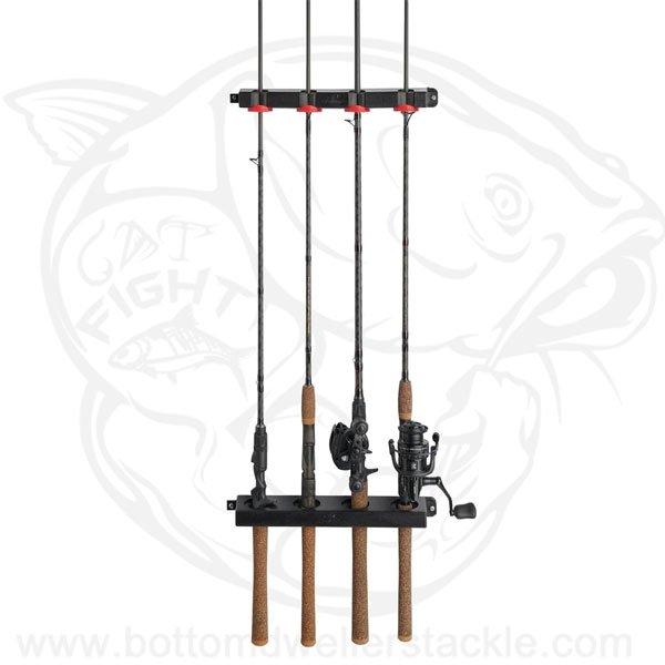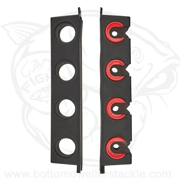 The Berkley® Twist Lock Utility 4-rod rack saves space while neatly and securely storing up to 4 complete rod and reel combos. Ideal for mounting in boats and on UTVs. ##Use enclosed screws to attach to wood, metal, fiberglass or plastic. Use suitable wall anchor when applying to sheetrock or wallboard. Spacing between mounts vary depending on gear stored - recommended spacing between mounts is approximately 42.