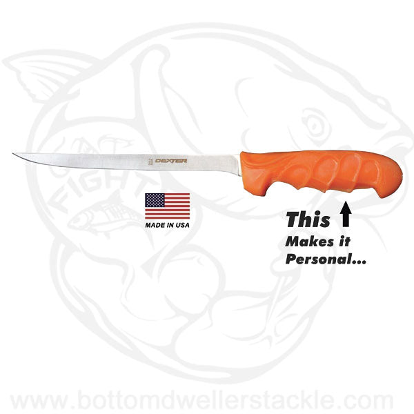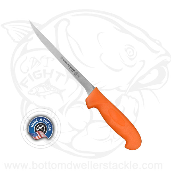 The Dexter UC133-7 7" UR-Cut® Flexible Fillet Knife makes filleting and skinning your fillets easy. It's ultra-sharp out of the package and with just the right amount of flex to glide over the bones. Dexter Outdoors now provides the latest in handle technology... personalized handles. Moldable handle material allows the user to form each handle to their particular grip, making the handle more comfortable to use and easier to grip. It features our proprietary high carbon, high alloy, stain free DEXSTEEL™. This knife is NSF certified and is made in the U.S.A.