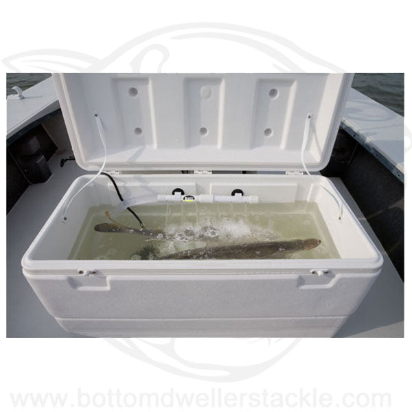 12-volt bilge pump and aerator kit. Fills, aerates and empties any livewell. Adjusts to any size insulated chest, livewell or container.