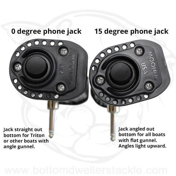 All models provide a wide lighted area. Late model Triton boats with inward sloping top caps should use a 0 degree model if the female connector is mounted on the inward sloping section. The Triton's angled top cap results in the 0 degree light being tilted up similar to a 15 degree model.