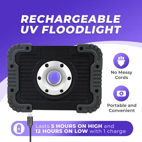 - The ONLY battery powered UV floodlight on the market - the first of it's kind to be found anywhere. Don't hassle with cords. Enjoy the blacklight decorations with this new technology.