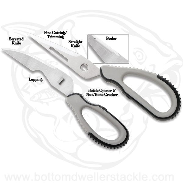 One tool for a multitude of cutting tasks. Shears are great for heavy leverage lopping to fine detail trimming. Includes straight knife and serrated knife/fish scaler, bottle opener/bone cracker and vegetable peeler. 2-piece design allows for easy cleaning. Oversize grip is ideal size for large hands or working with gloves on.