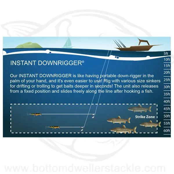 Our first product that allowed us to put our baits in the zone. Fish any depth for any species you favor. Troll at speeds your species prefer, just add the weight necessary to get it to the depth you marked your fish at. If you don't have a fishfinder use different weights to find your first strike and switch your other rigs to that weight and your set!